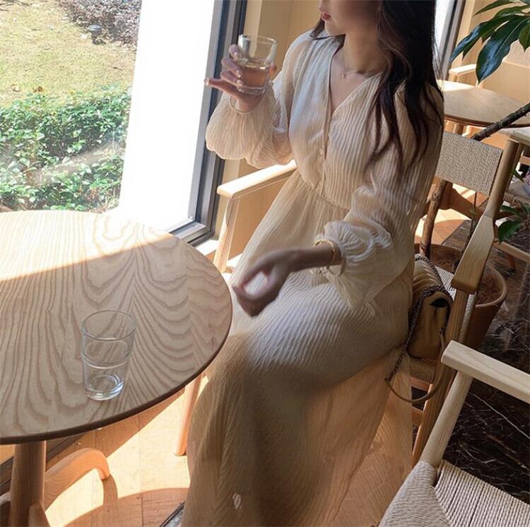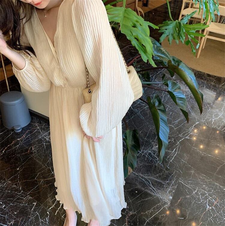 INSスタイル sweet系 プリーツ シフォン ワンピース Vネック ウエストを収める エレガント