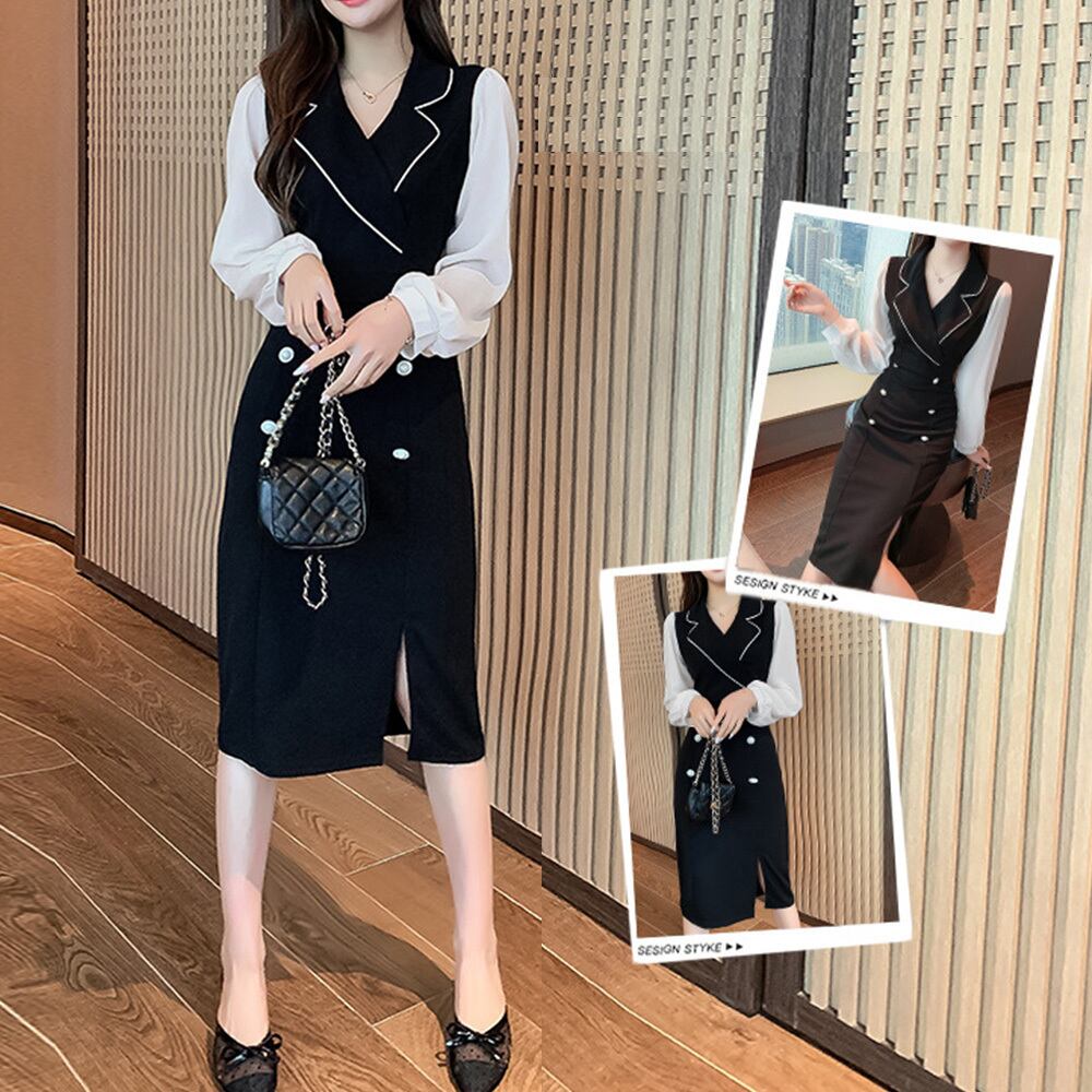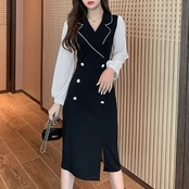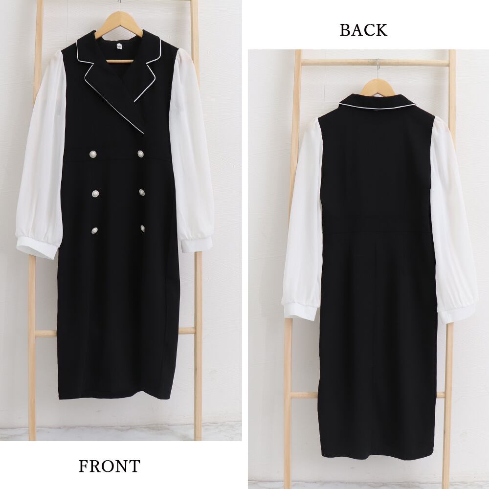 テーラード風の折り襟に異素材切り替えスリーブを加えたタイトシルエットのドッキングワンピース