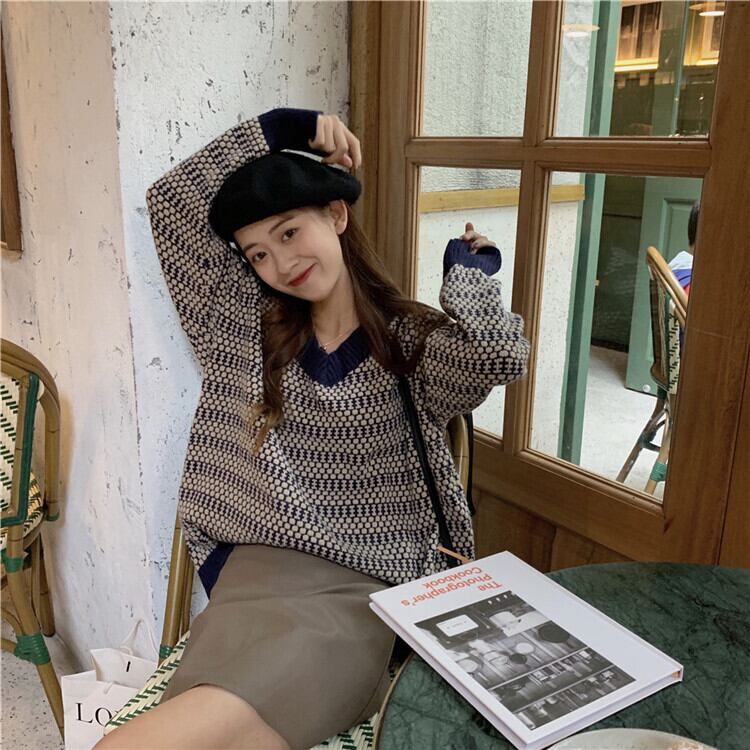 韓国ファッション sweet系 百掛け ルーズ Vネック セーター カレッジ風