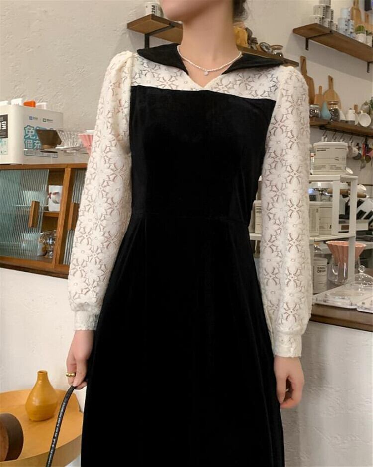 縫付 ラペル ハイウエスト レース ベルベット ワンビース スリムフィット sweet系 百掛け