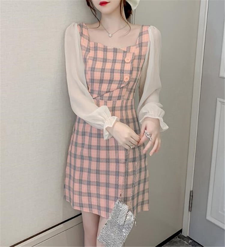 長袖 スクエアネック ワンピース スリムフィット 気高い エレガント シフォン 縫付 百掛け