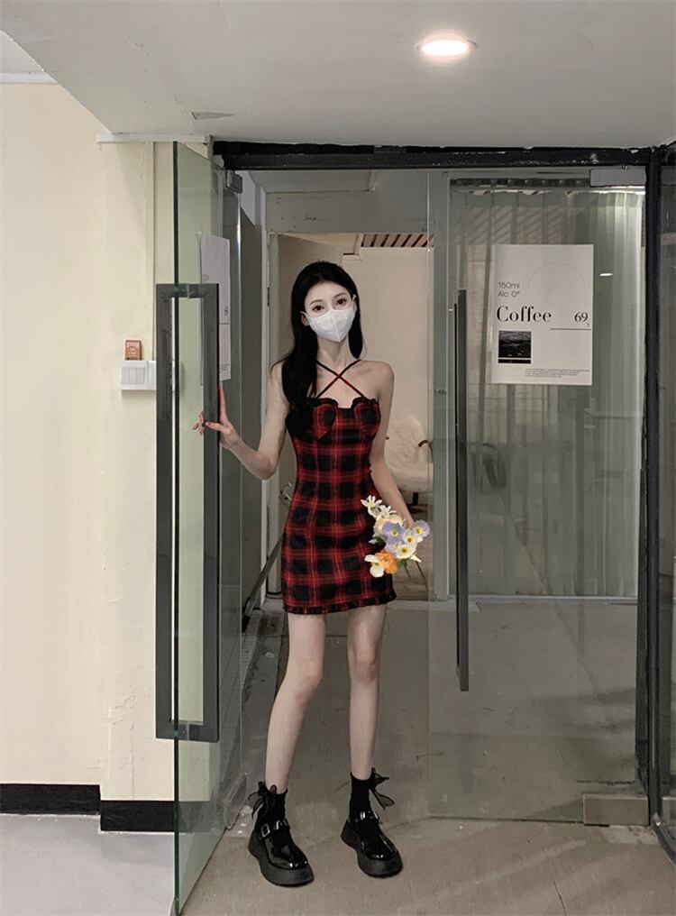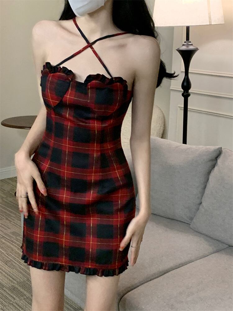 タイトスカート 格子縞 ロマンティック スリム キャミワンピ ミニスカート