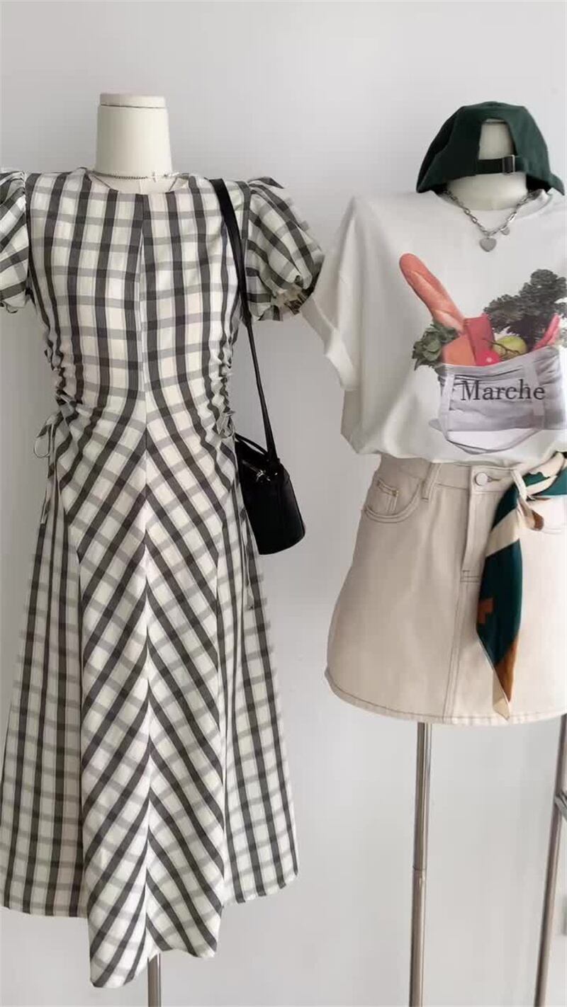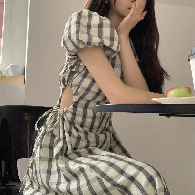 気質 エレガント 透かし彫り ラウンドネック チェック柄 カジュアルワンピース