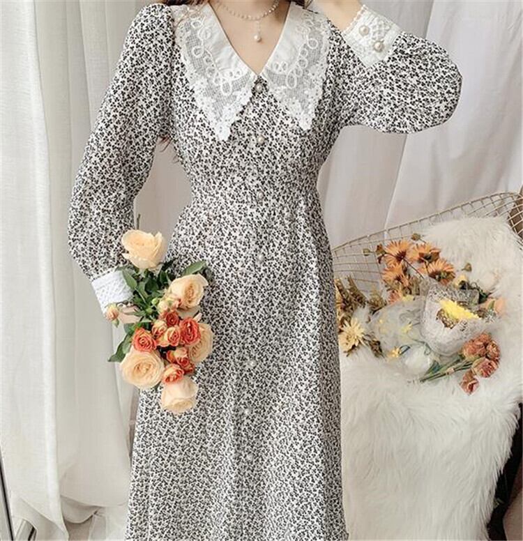 キャンディのように甘い ギャザリング 気質 Vネックレース ウエストスリム 壊れた花 ワンピース
