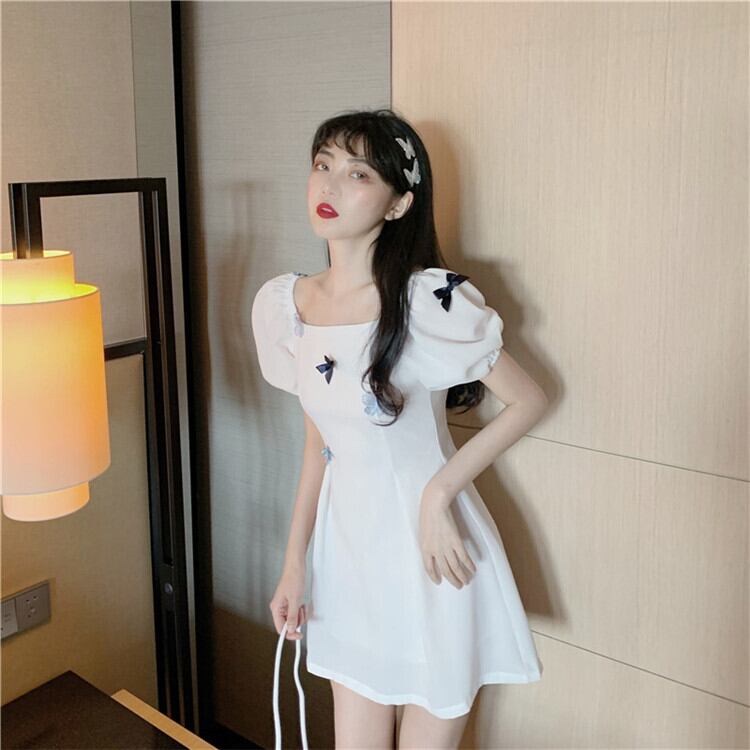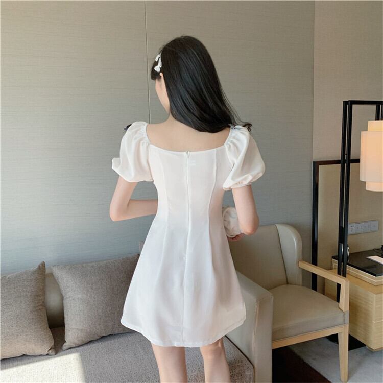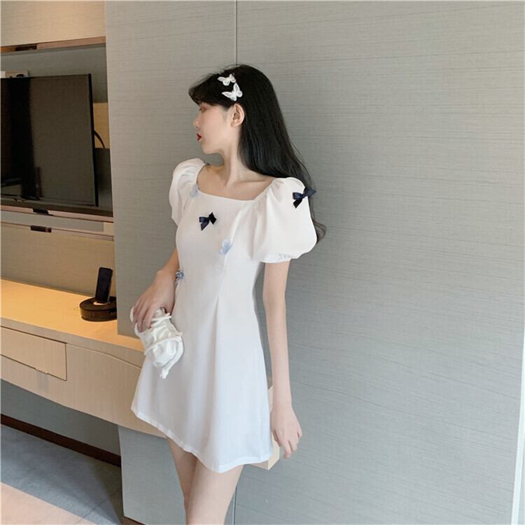 スリムフィット エレガント 百掛け ワンピース スクエアネック パフスリーブ 蝶結び