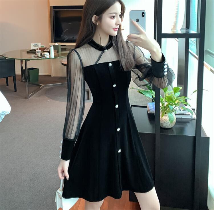 韓国ファッション メッシュ 縫付 ワンピース レトロ スタンドアップカラー 百掛け
