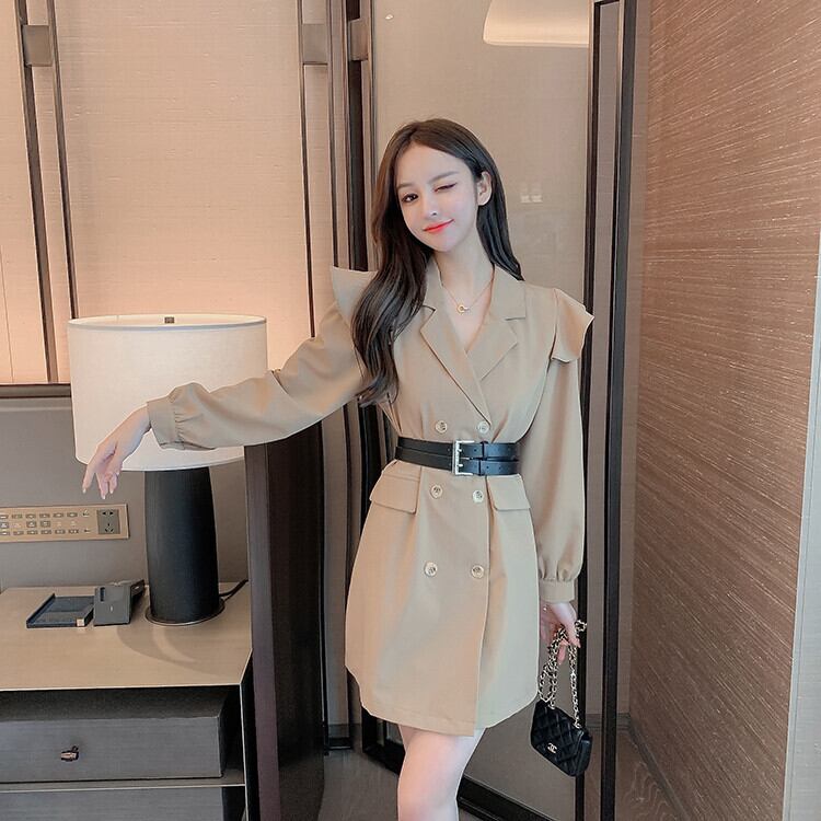 INSスタイル ラペル 長袖 ワンピース 百掛け レトロ ダブルボタン フライングスリーブ 気質 ベルト