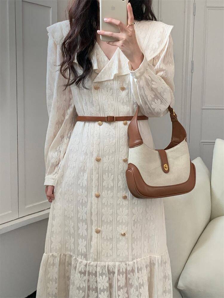 レース かぎ針編み ワンピース Vネック ロングスカート フリル ダブルボタン