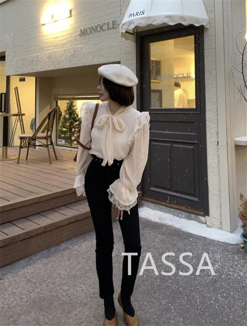 韓国系 気質 ゆったり レース飾り リボン ベルスリーブ ラウンドネック シャツ