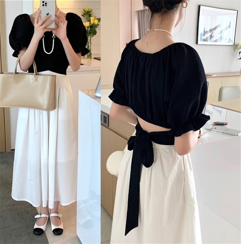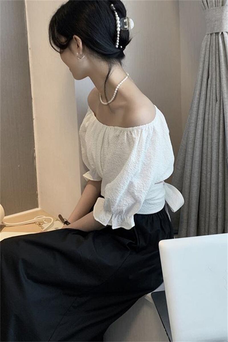 気質 スウィート ゆったり パフスリーブ オフショルダー リボン シャツ/ブラウス