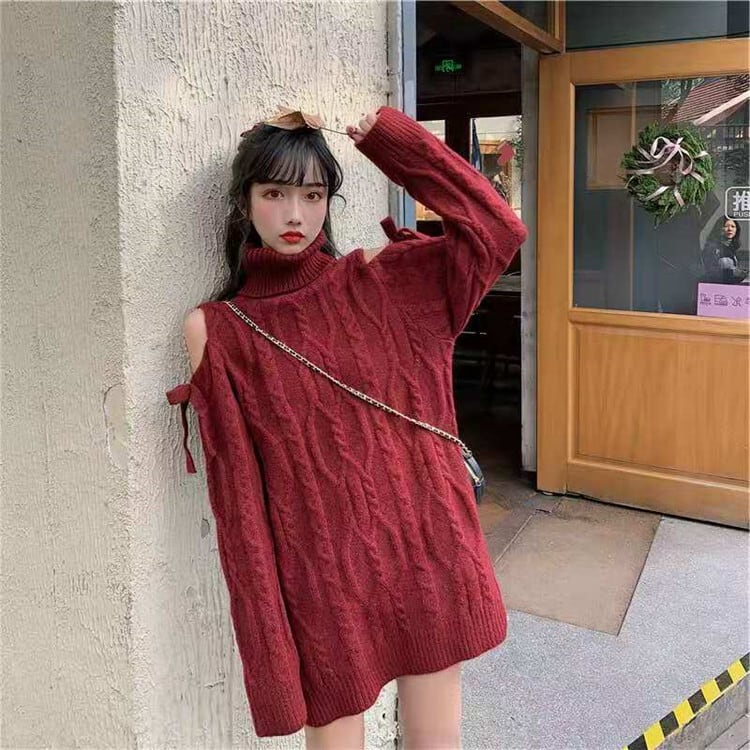 タートルネック 長袖 セーター 透かし彫り オフショルダー 蝶結び sweet系 百掛け スリム